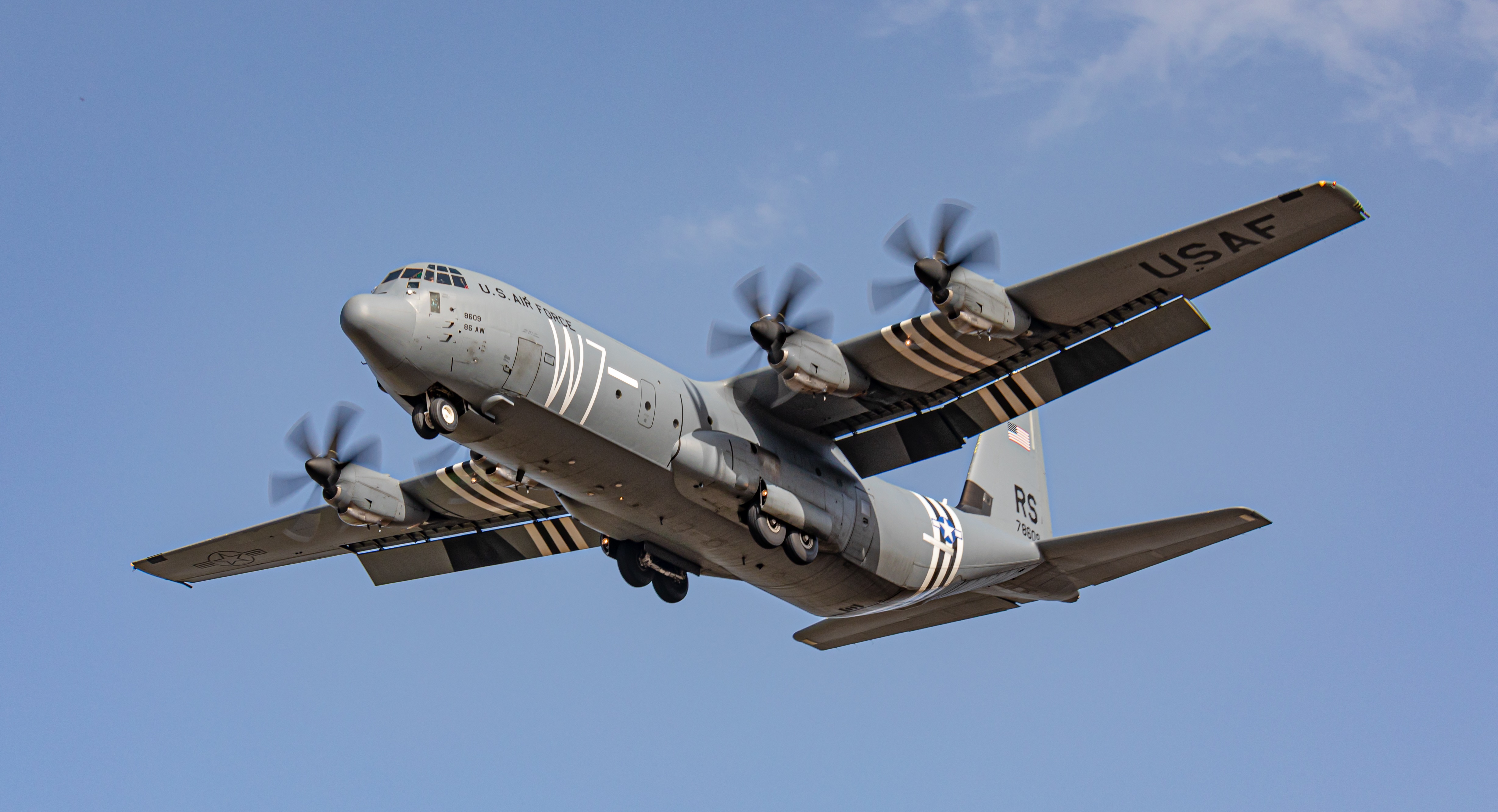 Lockheed C-130 Hercules | ![]() Ramstein Air Base fungiert als Drehkreuz der US-Militärlogistik in Europa, besitzt allerdings nur eine Handvoll eigener Flugzeuge. Diese gehören zum 86. Airlift Wing und umfassen unter Anderem Transportflugzeuge vom Typ C-130J-30 Super Hercules. Diese Flugzeuge sind täglich in und um Ramstein zu sehen, führen Aufgaben in ganz Europa aus und trainieren oft Anflüge und Platzrunden an der Air Base. Gelegentlich kann man sie auch in Spangdahlem oder Stuttgart antreffen. Die C-130 wird von vielen NATO-Ländern und Verbündeten geflogen, weshalb Besuche dieser Maschinen in Deutschland hin und wieder einmal vorkommen können. Länge: 29,79 m bzw. 34,36 m