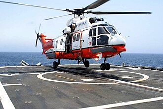 AS332 Super Puma | ![]() Die Aérospatiale AS 332 ist ein Hubschrauber des französischen Herstellers Aérospatiale, später Eurocopter und heute Airbus Helicopters. Die AS 332 wird sowohl zivil mit dem Beinamen „Super Puma“ als auch militärisch als „Cougar“ verwendet. Sie ist ein vergrößerter Entwurf auf Basis der Aérospatiale SA 330. Der Erstflug fand am 13. September 1978 statt. Die neueste zivile Variante ist die H225, sie ist mit einem klappbaren fünfblättrigen Hauptrotor anstatt eines vierblättrigen ausgerüstet und weist ein erhöhtes Abfluggewicht auf. Von dieser Version existiert auch eine militärische Variante, die H225M Caracal.